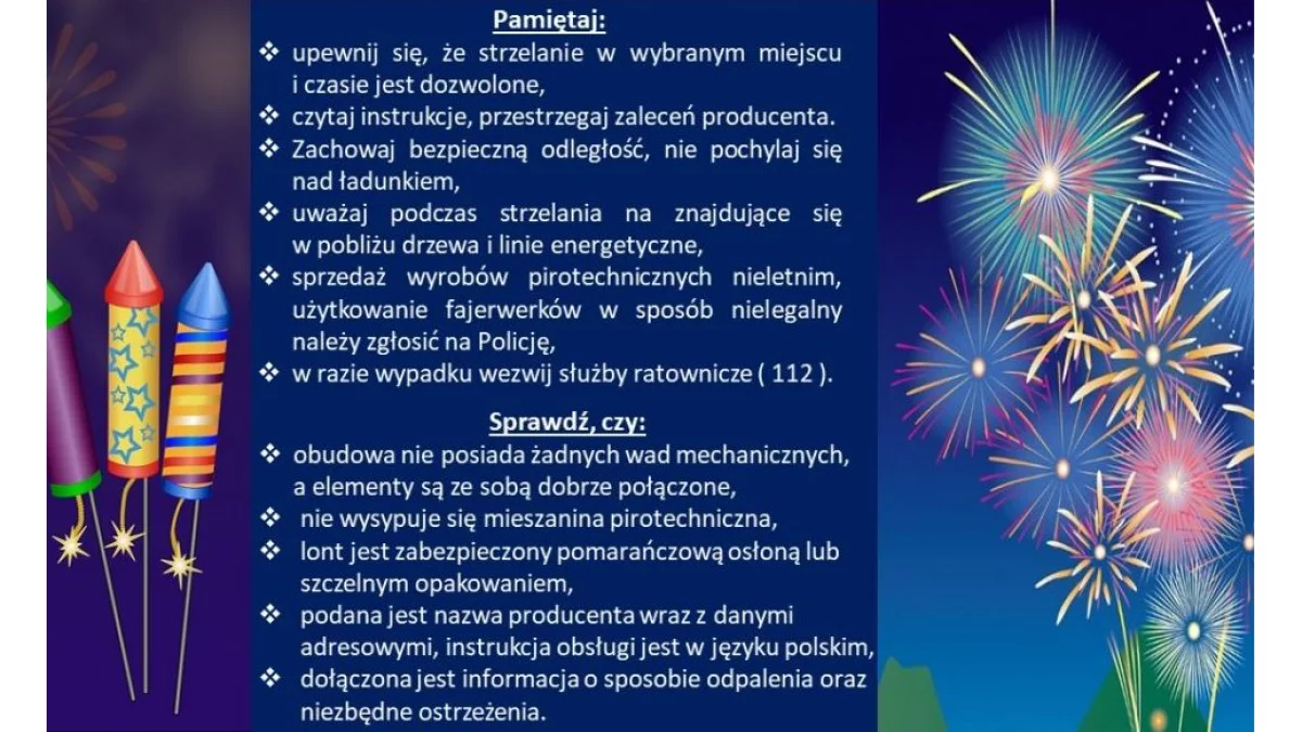 W Sylwestra i Nowy Rok używanie fajerwerków jest dozwolone wyłącznie z zachowaniem wszelkich zasad bezpieczeństwa – zarówno dla ludzi, mienia, jak i środowiska. W przypadku osób niepełnoletnich konieczny jest bezpośredni nadzór rodzica lub opiekuna. Za złamanie obowiązujących przepisów grozi grzywna.