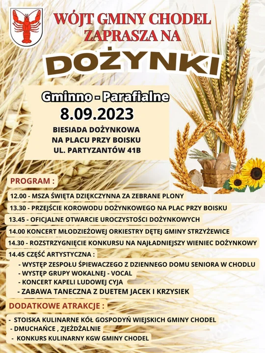 Dziękowanie za tegoroczne plony mieszkańcy gminy rozpoczną o godz. 12 od dziękczynnej mszy św. w miejscowym kościele. Na godz. 13.30 zaplanowane jest przejście barwnego korowodu z wieńcami na plac przy boisku w Chodlu (ul. Partyzantów 41B), a kwadrans później nastąpi powitanie gości i otwarcie uroczystości dożynkowych.