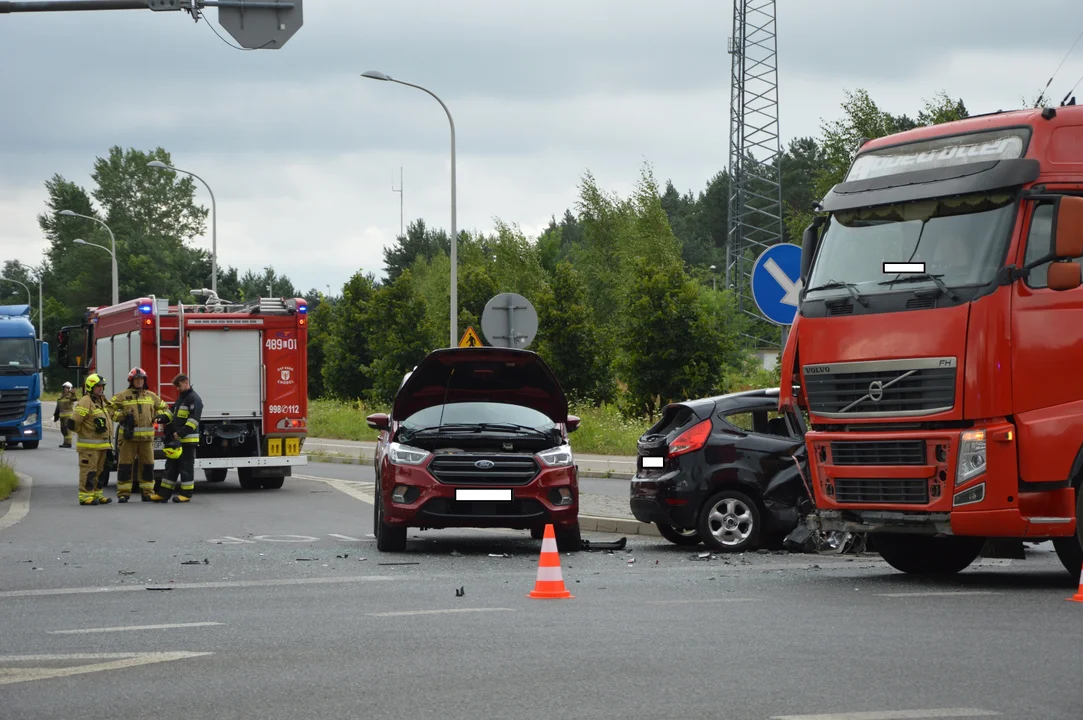 We wtorek doszło do groźnie wyglądającej kolizji drogowej na słynnym skrzyżowaniu w Chodlu. W zdarzeniu brały udział trzy pojazdy – dwa fordy i ciągnik siodłowy volvo.