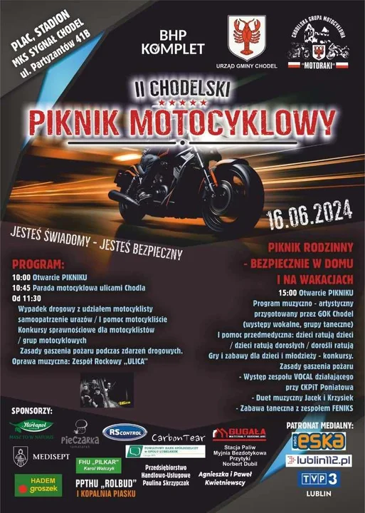 Będzie to już drugi Piknik Motocyklowy organizowany przez Chodelską Grupę Motocyklową Motoraki. Impreza startuje o godz. 10 na parkingu przy nowym stadionie. W tym roku towarzyszy jej hasło „Jesteś świadomy – jesteś bezpieczny”.