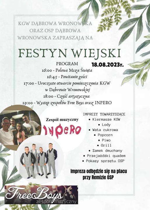 Przewidziana jest część artystyczna i występy zespołów Free Boys oraz Inpero. Będą przejażdżki quadem, zamek dmuchany i pokazy strażackie dla najmłodszych. Dla starszych grill i napój z pianą.