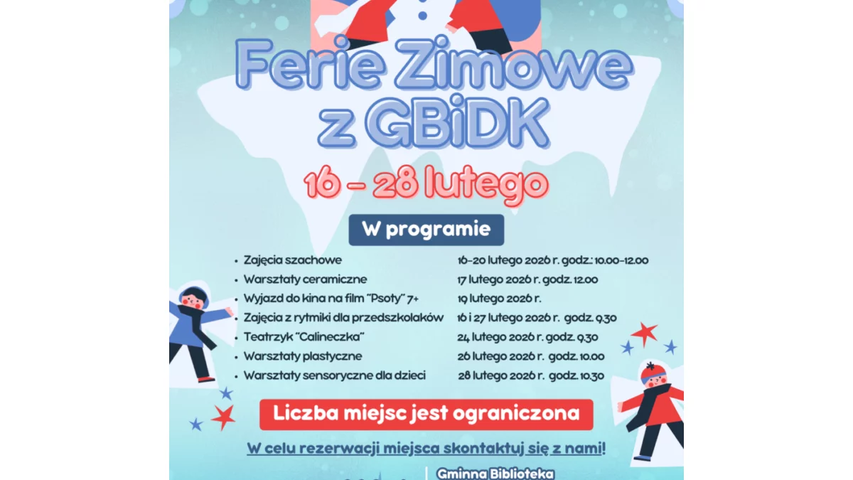 W programie znalazły się m.in. zajęcia szachowe (16 - 20 lutego w godz. 10.00 - 12.00), warsztaty ceramiczne (17 lutego), wyjazd do kina „Czyn” w Poniatowej na film „Psoty” (19 lutego - zbiórka o godz. 10.00), a także teatrzyk „Calineczka” (24 lutego, godz. 9.30). Na uczestników czekają również warsztaty plastyczne (26 lutego), zajęcia rytmiczne (16 i 27 lutego - dwie grupy: godz. 9.30 i 10.30) oraz warsztaty sensoryczne „Dino Świat” dla dzieci w wieku 5 - 8 lat (28 lutego, godz. 10.30).