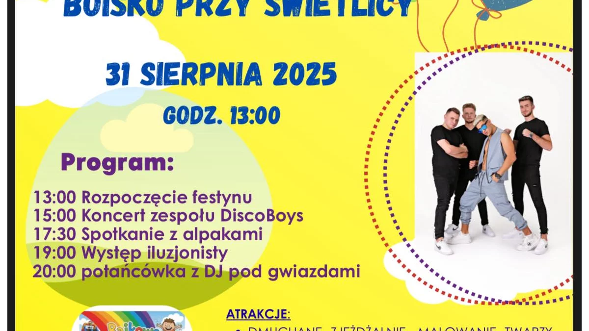 Organizatorzy przygotowali bogaty program artystyczny i rozrywkowy. O godzinie 15 na scenie wystąpi znany zespół DiscoBoys, a wieczorem na uczestników czekają kolejne atrakcje – spotkanie z alpakami (17.30), pokaz iluzjonisty (19.00) oraz potańcówka pod gwiazdami z DJ-em (20.00).
