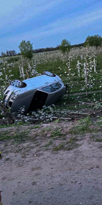 Na miejscu interweniowali strażacy, policja i pogotowie ratunkowe. Auto przewróciło się na bok, niszcząc kilka drzewek rosnących w sadzie.