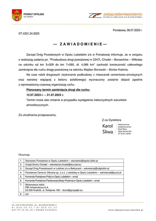 Jak zastrzega ZDP, termin zamknięcia drogi może ulec zmianie, wszystko zależeć będzie od warunków atmosferycznych.