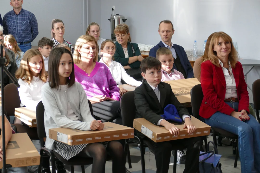 Przedstawiciele klas czwartych otrzymali podczas spotkania przenośne komputery.