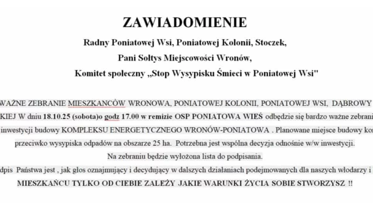 Podczas zebrania omówione zostaną szczegóły planowanej inwestycji, która ma powstać na terenie o powierzchni 25 hektarów położonym naprzeciwko obecnego wysypiska odpadów. Organizatorzy podkreślają, że od decyzji i zaangażowania mieszkańców zależy dalszy kierunek działań w tej sprawie.