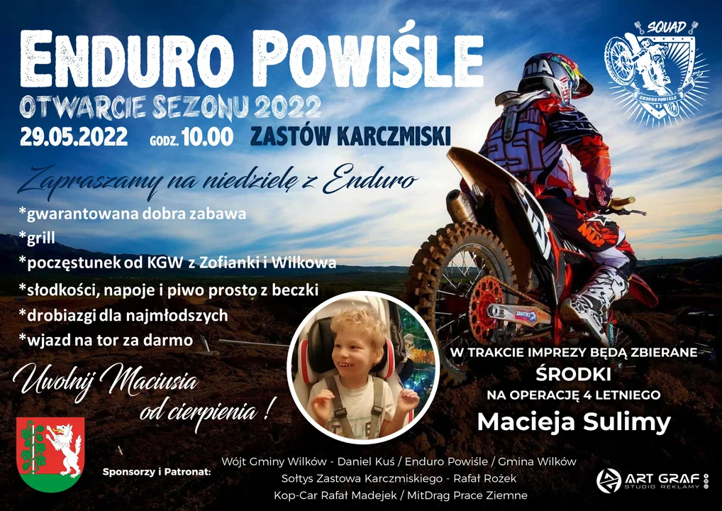 Wielkie otwarcie sezonu na amatorskim torze w Zastowie Karczmiskim już niedługo. Liczni miłośnicy jazdy na motorach z Enduro Powiśle zapraszają zainteresowanych 29 maja. Mile widziani są wszyscy - zarówno osoby jeżdżące na motorach, jak i widzowie, również ci najmłodsi. Wjazd motocyklem na tor będzie darmowy. Organizatorzy imprezę postanowili połączyć z pomaganiem - pomogą 4-letniemu Maciusiowi Sulimie.