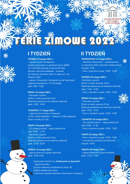 - wyjazd na sanki do Rąblowa (zapisy w godzinach pracy GBiDK do 12 lutego). Będzie ognisko i pieczenie kiełbasek – prowiant we własnym zakresie. Dzieci w wieku od 7 lat,