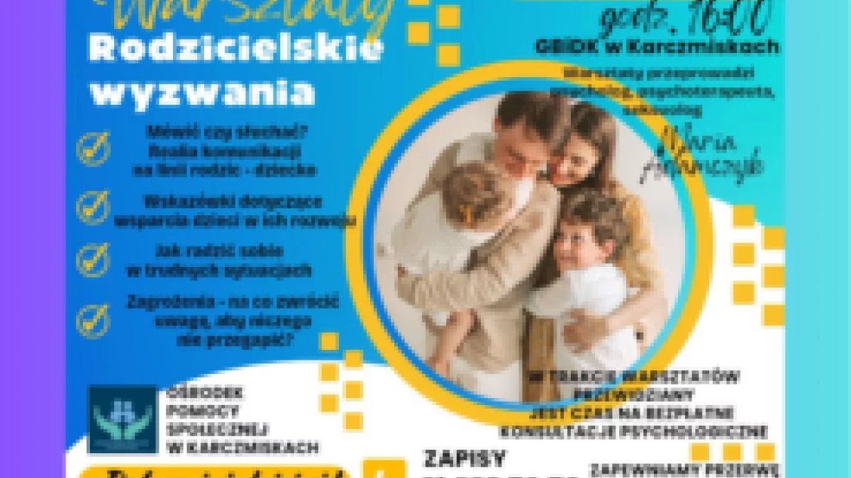 Pierwsze warsztaty "Rodzicielskie Wyzwania" zaplanowane są na najbliższą środę, 26 lutego i odbędą się w Gminnej Bibliotece i Domu Kultury w Karczmiskach o godzinie 16.