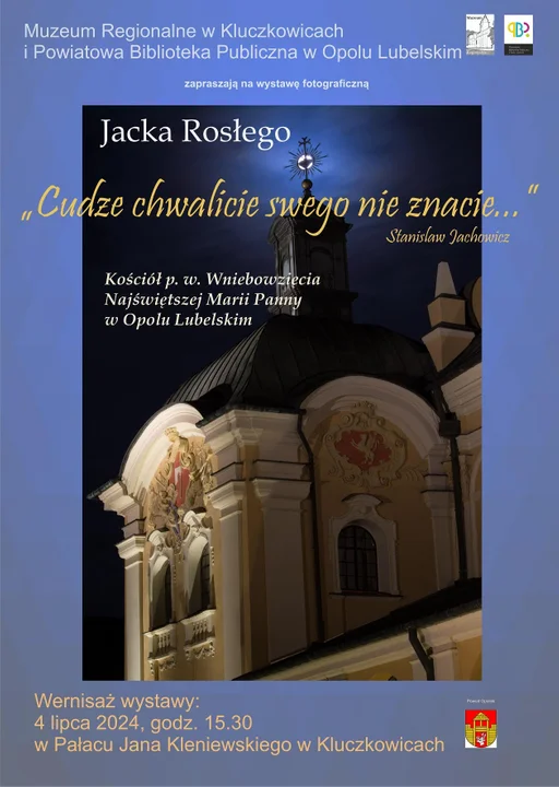 Informacje opolskieOtwarcie wystawy Jacka Rosłego "Cudze chwalicie, swego nie znacie…" (Stanisław Jachowicz) Kościół pw. Wniebowzięcia Najświętszej Marii Panny w Opolu Lubelskim odbędzie się w czwartek, 4 lipca w Muzeum Regionalnym w Kluczkowicach o godzinie 15.30.