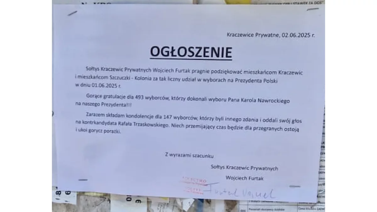 - Sołtys Kraczewic Prywatnych Wojciech Furtak pragnie podziękować mieszkańcom Kraczewic i mieszkańcom Szczuczki-Kolonia za tak liczny udział w wyborach na Prezydenta Polski w dniu 01.06.2025 r. - tak rozpoczyna się ogłoszenie sołtysa, które pojawiło się na tablicach w obu miejscowościach (pisownia oryginalna).