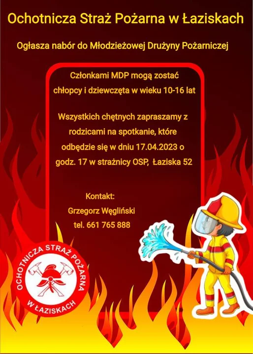 Spotkanie organizacyjne, na którym młodzi ludzie będą mogli wstąpić w szeregi Ochotniczej Straży Pożarnej w Łaziskach, odbędzie się w poniedziałek, 17 kwietnia o godz. 17 w tamtejszej remizie (adres: Łaziska 52).