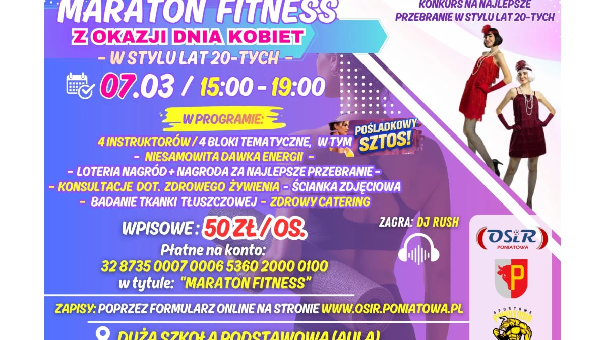 7 marca w auli Szkoły Podstawowej przy ul. Szkolnej 8 odbędzie się „Maraton Fitness z okazji Dnia Kobiet” - kilkugodzinne wydarzenie sportowo-rekreacyjne przygotowane z myślą wyłącznie o paniach.