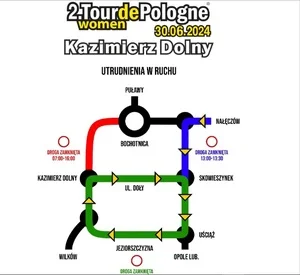 - drodze powiatowej nr 2529L gdzie zlokalizowana będzie meta wyścigu oraz miasteczko zespołów kolarskich. (Bochotnica, al. Kazimierza Wielkiego, ul. Tyszkiewicza) w godz. 7 - 16 (możliwy dojazd tylko do posesji),