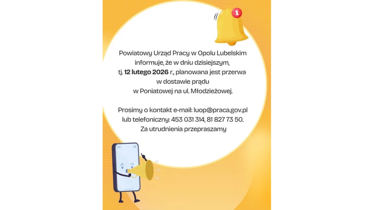 Powiatowy Urząd Pracy w Poniatowej przeprasza za wszelkie niedogodności i zapewnia, że dołoży wszelkich starań, aby obsługa interesantów odbywała się sprawnie po przywróceniu zasilania.