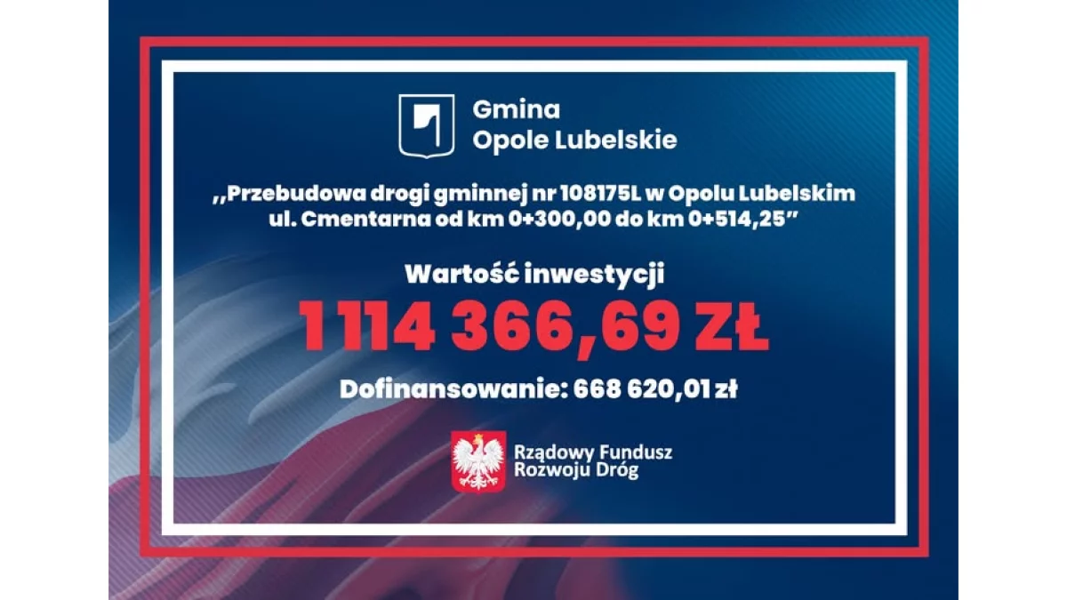 Wartość inwestycji wynosi 1 114 366,69 zł, z czego aż 668 620,01 zł stanowi dofinansowanie z Rządowego Funduszu Rozwoju Dróg.