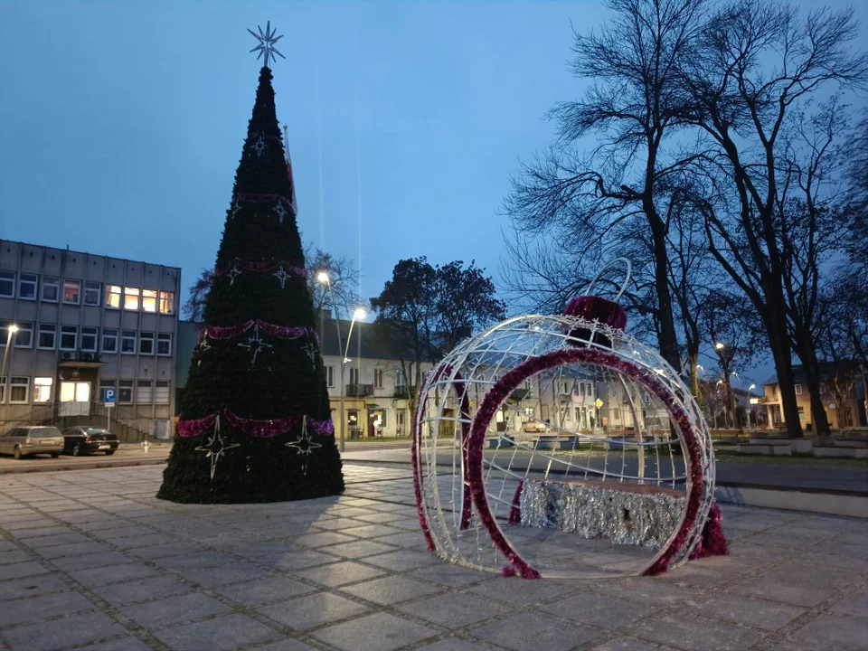 Na Skwerze Miejskim stanęła wielka choinka i świąteczna bombka z ławeczką.