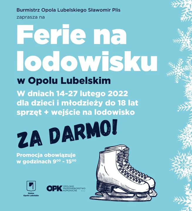 W czasie ferii zimowych, w dniach od 14 do 27 lutego, dzieci i młodzież do 18 roku życia skorzystają z lodowiska w Opolu Lubelskim bezpłatnie. Darmowe będzie nie tylko wejście na lodowisko, ale także wypożyczenie sprzętu.