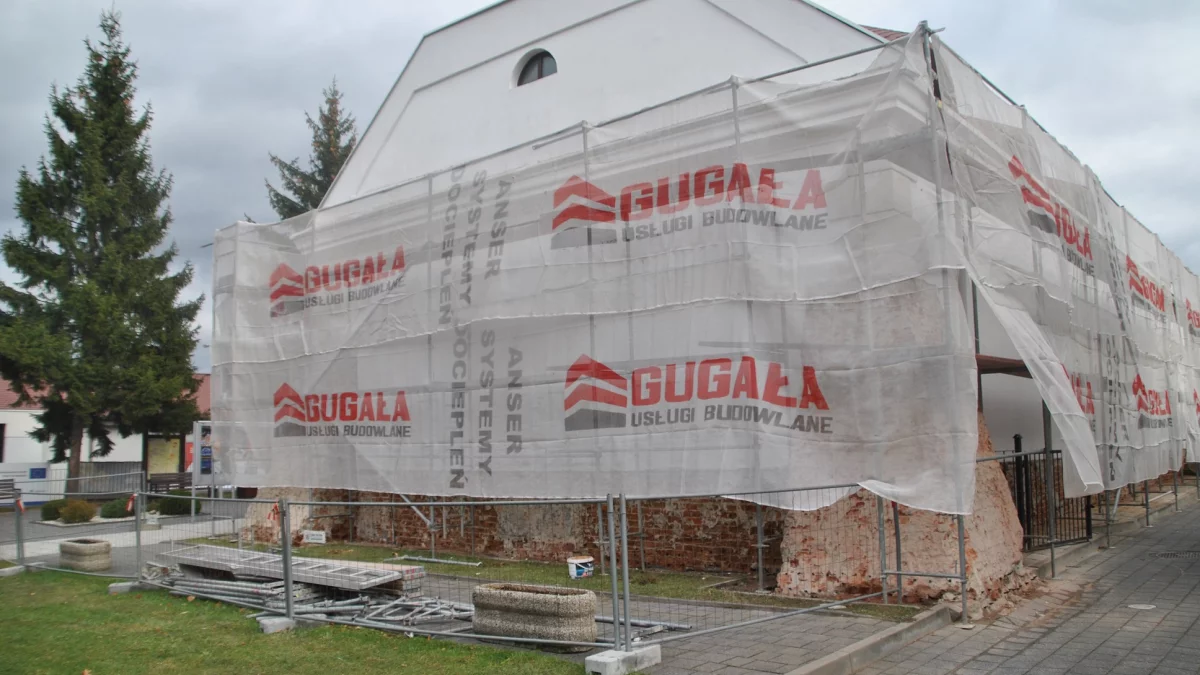 Zabytkowy spichlerz zasłoniła siatka, spod której wyłania się już skuta część starych tynków. Zastąpić mają je nowe. Na nowo pomalowana zostanie też cała elewacja. Do wymiany idą rynny, rury spustowe i obróbki blacharskie. Przewidziane jest również mycie dachu na części zabytkowej, a na wschodniej, nowszej części budynku wymiana pokrycia dachowego.