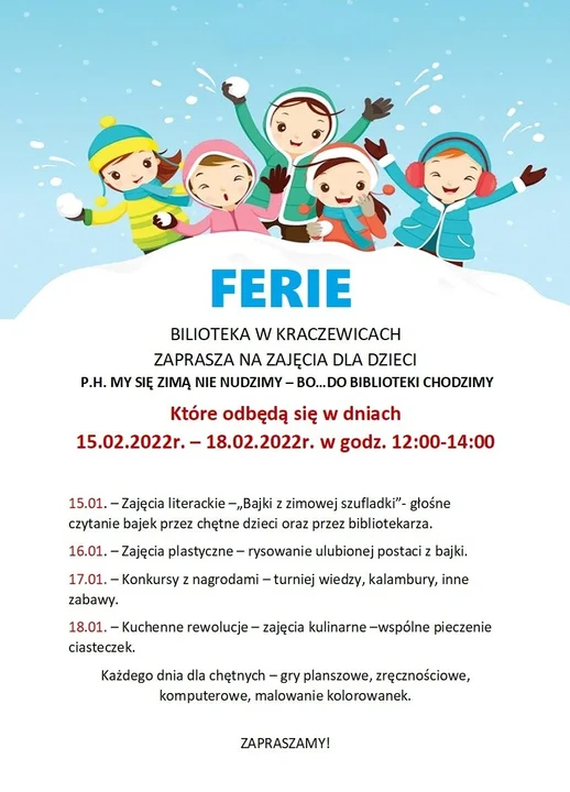 Miejsko-Gminna Biblioteka w Opolu Lubelskim i Biblioteka w Kraczewicach zapraszają dzieci na zajęcia, jakie zostaną zorganizowane w czasie zbliżających się ferii zimowych.