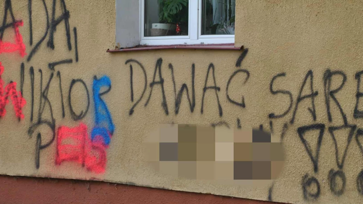 Ktoś w nocy postanowił upiększyć ścianę… tyle że zamiast artystycznego muralu pojawił się wulgarny bazgroł.