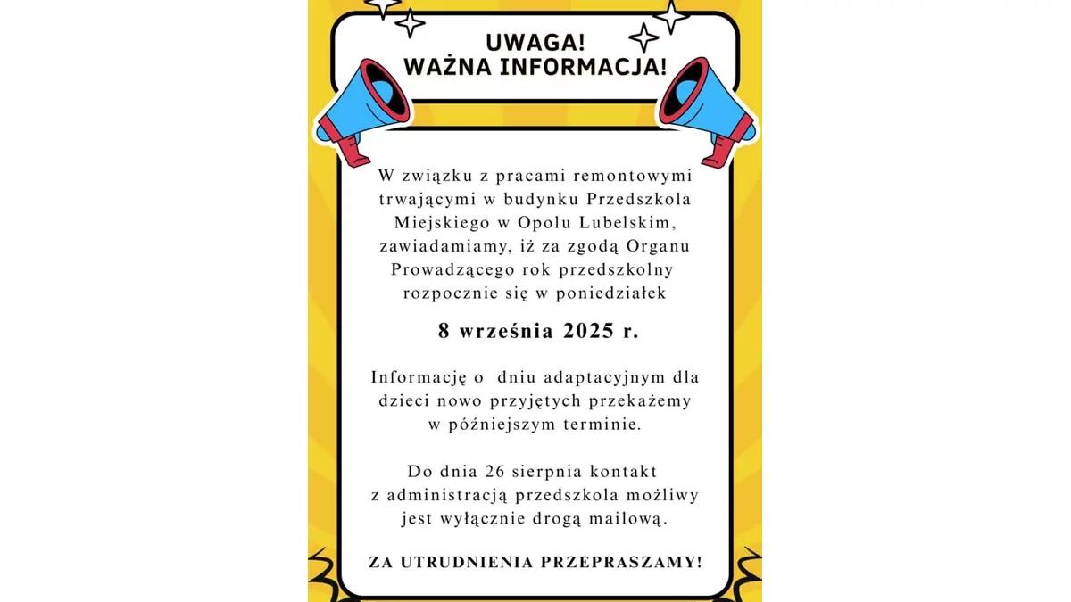 Dyrekcja placówki przeprasza za niedogodności, ale podkreśla, że remont jest konieczny, aby dzieci mogły korzystać z nowoczesnych i bezpiecznych sal.