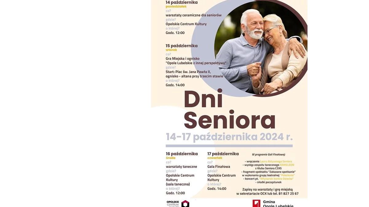 Informacje opolskieJuż w najbliższy poniedziałek, 14 października w Opolu Lubelskim rozpoczną się wydarzenia skierowane do nieco starszych mieszkańców gminy. Do 17 października będziemy świętować Dni Seniora.