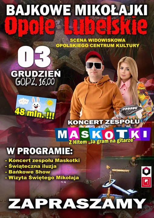 A wystąpi zespół "Maskotki". Będą też świąteczne iluzje show bańkowe i oczywiście... spotkanie ze Świętym Mikołajem!