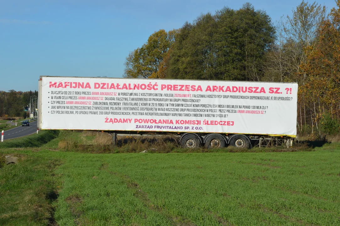 Przed wyborami parlamentarnymi kilka kilometrów od Opola Lubelskiego, przy drodze wojewódzkiej 747, stanęła przyczepa z zawieszonym potężnym banerem. Ale nie był to baner wyborczy. Z treści, jaka na nim widnieje, można wyczytać, że związek z jego ustawieniem mają członkowie zarządu istniejącej kilka lat temu w powiecie opolskim grupy producenckiej Fruvitaland. Grupa upadła, syndyk sprzedaje jej majątek, a członków zarządu prokuratura oskarżyła. Proces trwa. Przyczepa stoi do dziś.