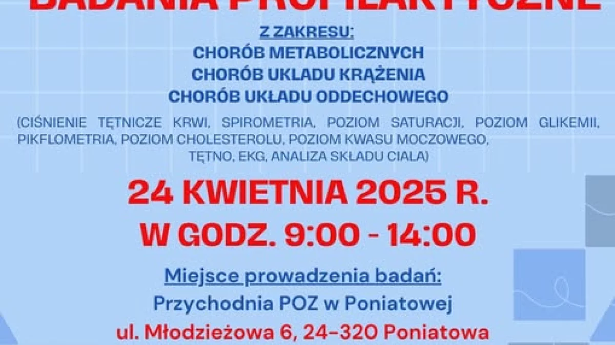 Informacje opolskieSeniorzy z gminy Poniatowa już w najbliższy czwartek, 24 kwietnia będą mogli skorzystać z bezpłatnych badań profilaktycznych.