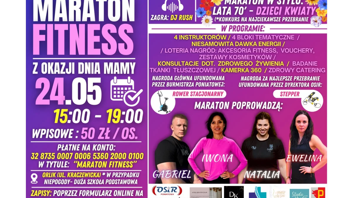 - Czasu do rozpoczęcia maratonu zostało coraz mniej więc nie ma chwili do stracenia! W dalszym ciągu trwają zapisy poprzez formularz online: https://osir.poniatowa.pl/zapisy-na-maraton-fitness-24-05/, dlatego serdecznie zapraszamy wszystkie chętne Panie. Nie ma znaczenia poziom zaawansowania czy brak doświadczenia z fitnessem. Na naszym Maratonie każdy znajdzie coś dla siebie i bez problemu poradzi sobie bez względu na poziom swoich umiejętności - zapraszają organizatorzy.