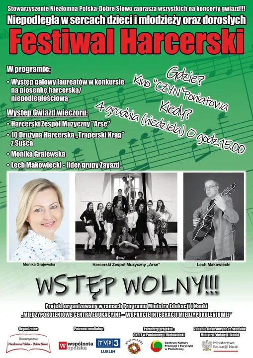 "Niepodległa w sercach dzieci i młodzieży oraz dorosłych" to pierwszy organizowany w Poniatowej Festiwal Piosenki Harcerskiej/Patriotycznej. Wydarzenie realizowane jest w ramach Programu Ministra Edukacji i Nauki „MIĘDZYPOKOLENIOWE CENTRA EDUKACYJNE – WSPARCIE INTEGRACJI MIĘDZYPOKOLENIOWEJ”. Organizatorem jest Stowarzyszenie Niezłomna Polska Dobre Słowo z prezesem Michałem Kramkiem.