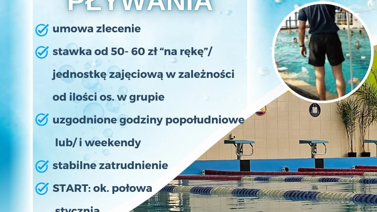 Ośrodek Sportu i Rekreacji w Poniatowej poszukuje osoby na stanowisko instruktora pływania - na umowę zlecenie, ale "na rękę" za jedne zajęcia dostać będzie można 50 - 60 zł w zależności od liczebności grupy.