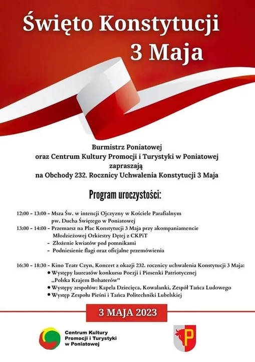 W Poniatowej, jak co roku, odbędzie się m.in.: uroczysta msza św. w intencji ojczyzny, przemarsz mieszkańców ulicami miasta i składanie wiązanek pod pomnikami. A wszystko w asyście Młodzieżowej Orkiestry Dętej z CKPiT-u. Na Placu Konstytucji 3 Maja nastąpi uroczyste wciągnięcie flagi państwowej na maszt i wspólne odśpiewanie hymnu państwowego.