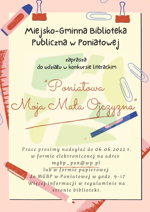 Prace w formie elektronicznej wysyłać można na adres e-mail mgbp_pon@wp.pl lub w formie papierowej dostarczyć w MGBP w Poniatowej w godz. 9-17.