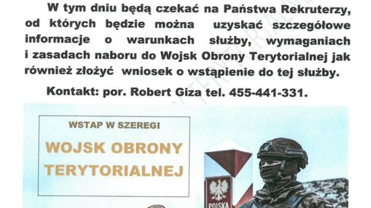 Każdy, kto jest zainteresowany służbą wojskową, a zwłaszcza wstąpieniem do Wojsk Obrony Terytorialnej, ma jeszcze chwilę na rozmowę z przedstawicielami wojska. Są oni do Waszej dyspozycji tylko do godziny 12 w Urzędzie Miejskim w Poniatowej (ulica Młodzieżowa 2).