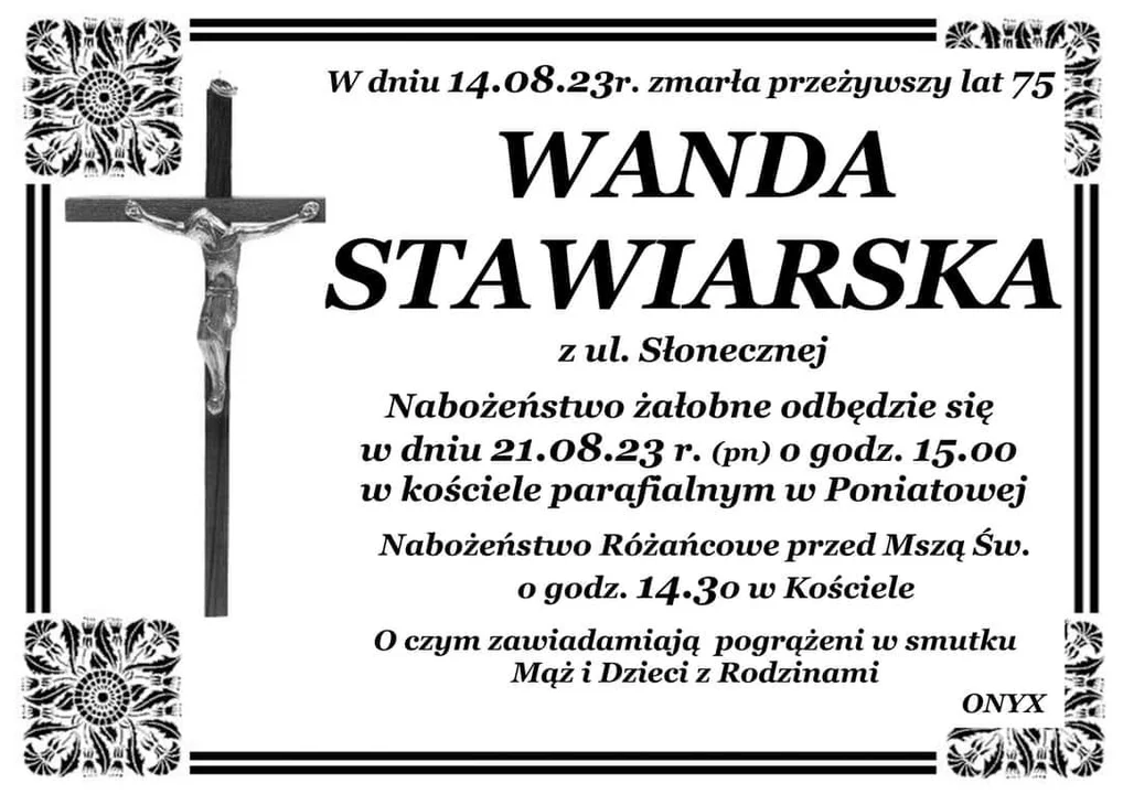 Pogrzeb śp. pani Wandy miał rozpocząć się o godz. 15 w kościele parafialnym w Poniatowej. Ale nie odbędzie się. Kiedy będzie możliwy pochówek, na razie nie wiadomo.