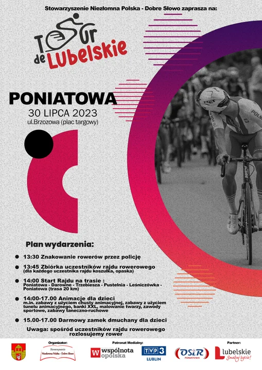 - Zapraszamy całe rodziny na pierwszą odsłonę Tour de Lubelskie w Poniatowej. To doskonała okazja do aktywnego i miłego oraz rodzinnego spędzenia niedzielnego południa – zachęca do udziału w niedzielnym rajdzie Michał Kramek, prezes Stowarzyszenia Niezłomna Polska - Dobre Słowo.