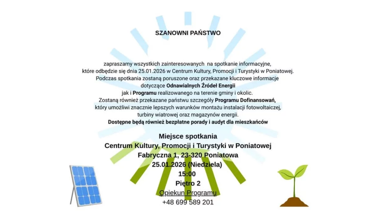 W Poniatowej szykuje się spotkanie informacyjne poświęcone odnawialnym źródłom energii. Wydarzenie odbędzie się 25 stycznia 2026 roku (niedziela) w Centrum Kultury, Promocji i Turystyki w Poniatowej.