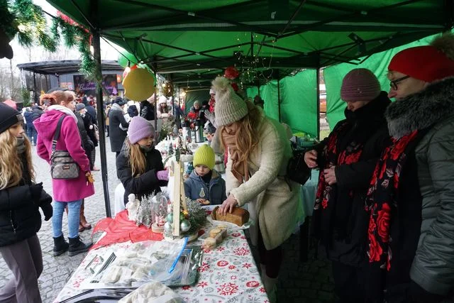 Plac Konstytucji 3 Maja wypełnił się świątecznymi stoiskami. A na nich różności... Panie z Kół Gospodyń Wiejskich z gminy Poniatowa przygotowały wigilijne potrawy. Przeważnie były to pierogi i uszka, które cieszyły się największym zainteresowaniem mieszkańców. Ale nie brakowało i świątecznych ciast i ciasteczek, zwłaszcza pierników.