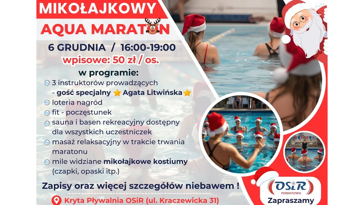 Zapisy na Mikołajkowy Aqua Maraton ruszą wkrótce i będą odbywać się telefonicznie oraz poprzez formularz online dostępny na stronie OSiR. Opłata wpisowa wynosi 50 zł i należy ją wpłacić na wskazany numer konta, podając w tytule przelewu „Aqua Maraton” wraz z imieniem i nazwiskiem uczestnika.