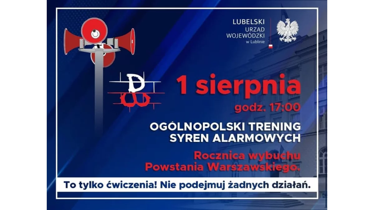 W ramach ćwiczeń uruchomiony zostanie dźwięk ciągły syreny alarmowej trwający jedną minutę. Dźwięk ten nie oznacza realnego zagrożenia — to tylko test systemu ostrzegania ludności.