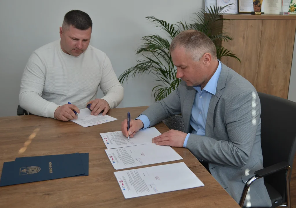 Podpis na dokumencie złożył starosta opolski, Dariusz Piotrowski oraz wykonawca zaplanowanych prac - Karol Chojnacki (Usługi Budowlane Karol Chojnacki).