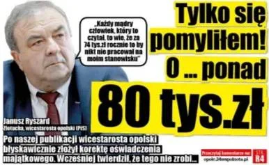 W oświadczeniu majątkowym za 2022 rok wicestarosta opolski, Janusz Zlotucha, wpisał nieprawdziwe dane dotczące swoich zarobków. Początkowo zadleklarował, że zarabia... 74.295 zł. Przed publikacją oświadczeń majątkowych członków Zarządu Powiatu Opolskiego kontaktowaliśmy się telefonicznie z panem Złotuchą, ale wówczas stwierdził, że żadnej korekty składać nie zamierza.