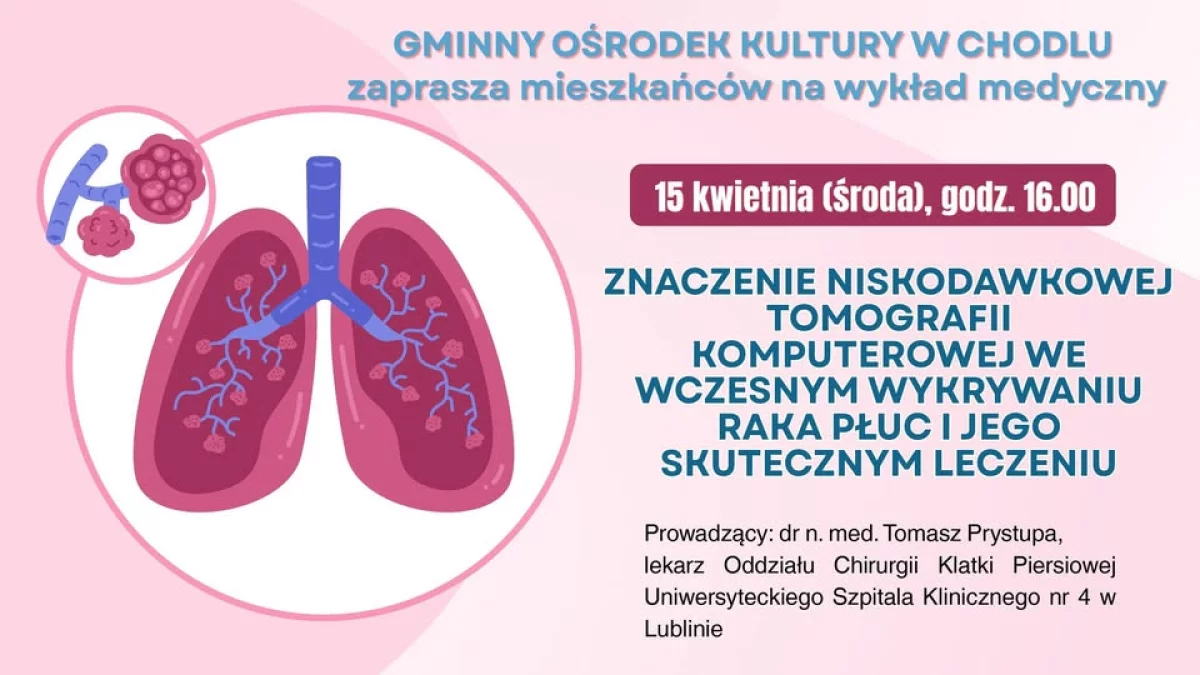 Już w najbliższą środę, 15 kwietnia w Gminnym Ośrodku Kultury odbędzie się wykład poświęcony wczesnemu wykrywaniu raka płuc.
