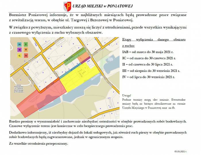- Prace prowadzić będziemy etapowo. Chcemy wyjść naprzeciw handlującym, aby w jak najmniejszym stopniu utrudnić im sprzedaż. Mimo wszystko mieszkańcy i sprzedawcy muszą liczyć się z utrudnieniami spowodowanymi tym, że kolejne obszary będą czasowo wyłączone z ruchu. Jest to konieczne, aby bezpiecznie można było przeprowadzić prace – mówi Paweł Karczmarczyk, burmistrz Poniatowej.
