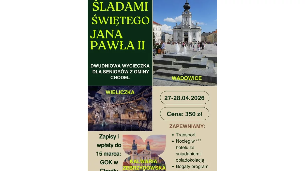 W programie znalazły się miejsca szczególnie związane z postacią Papieża Polaka. Uczestnicy odwiedzą Wadowice – rodzinne miasto Karola Wojtyły, a także Kalwarię Zebrzydowską, jedno z najważniejszych sanktuariów w Polsce. Na trasie wycieczki znalazła się również Wieliczka, gdzie zaplanowano zwiedzanie słynnej kopalni soli.