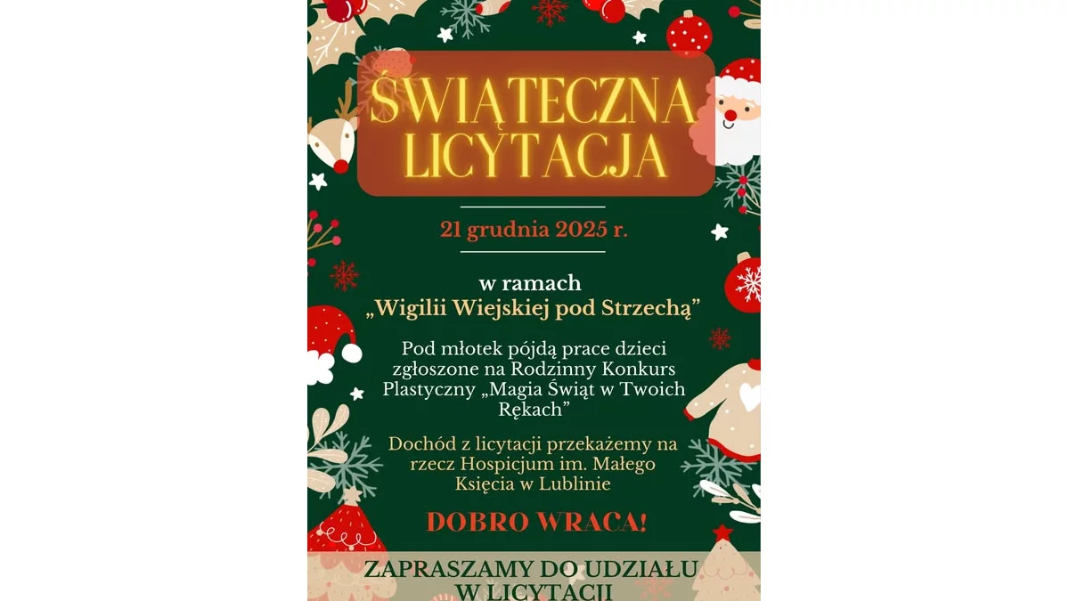 Co najważniejsze – dochód z licytacji zostanie w całości przekazany na rzecz Hospicjum im. Małego Księcia w Lublinie. Organizatorzy podkreślają, że to doskonała okazja, by przed świętami zrobić coś dobrego i wesprzeć potrzebujących.