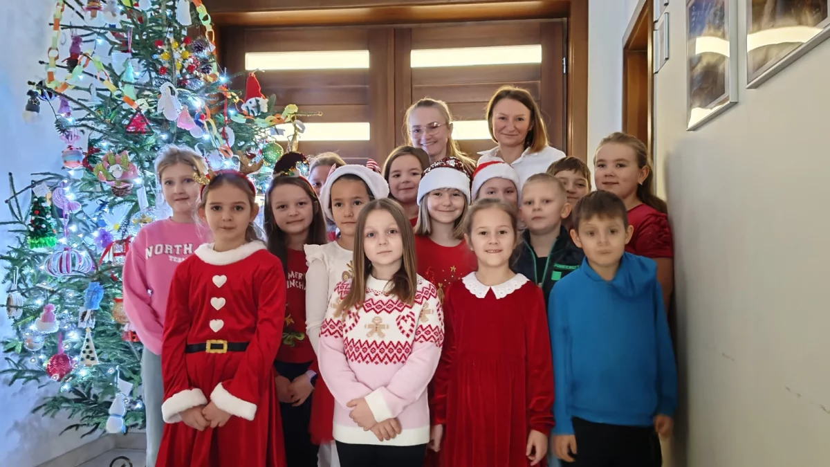 Ten szczególny moment najmłodsi uświetnili śpiewem kolęd i piosenek bożonarodzeniowych, tworząc ciepłą, serdeczną atmosferę, która udzieliła się wszystkim obecnym. Urząd na chwilę zamienił się w miejsce pełne uśmiechu, radości i świątecznego blasku.